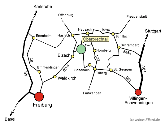 Von Norden über A5, Ausfahrt Offenburg -> B33 bis Haslach -> B294 Richtung Elzach -> Oberprechtal
